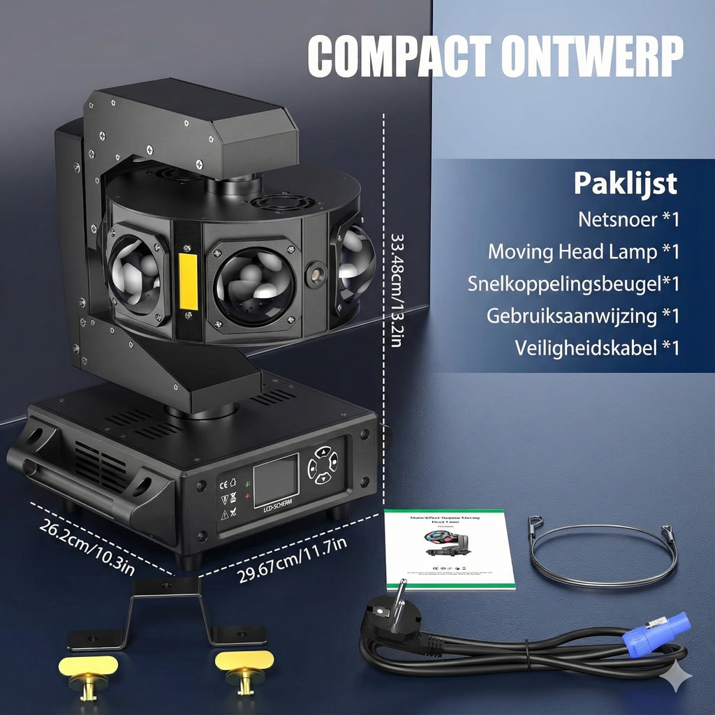 Het armatuur biedt 3-assige rotatie met een pan-bereik van 540°, tilt tot 320° en een oneindig roterende Z-as, waardoor de lichtbundels alle hoeken van de ruimte kunnen bereiken. Voor de aansturing kun je kiezen uit DMX512 (19 of 25 kanalen), geluidsgestuurde modus, master-slave en automatische programma’s, zodat de lamp zowel standalone als in een grotere lichtsetup is te integreren.