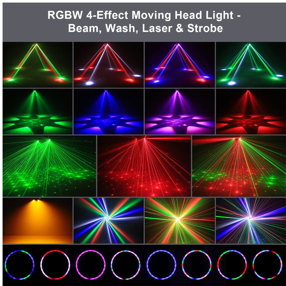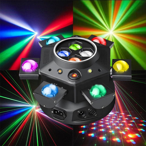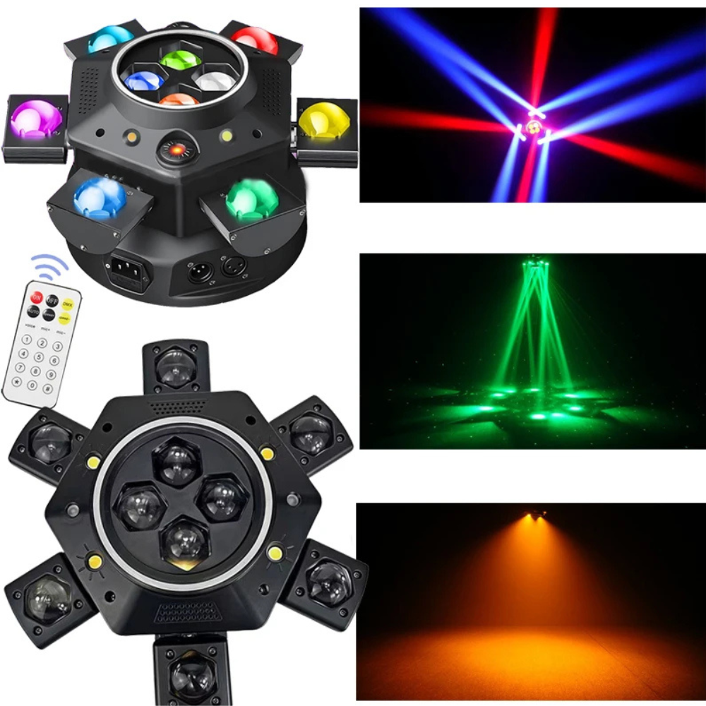 Complete 6-in-1 Lichtoplossing Dit compacte discotheek-systeem vervangt zes afzonderlijke lampen en biedt een volledig uitgerust arsenaal aan partyverlichting: