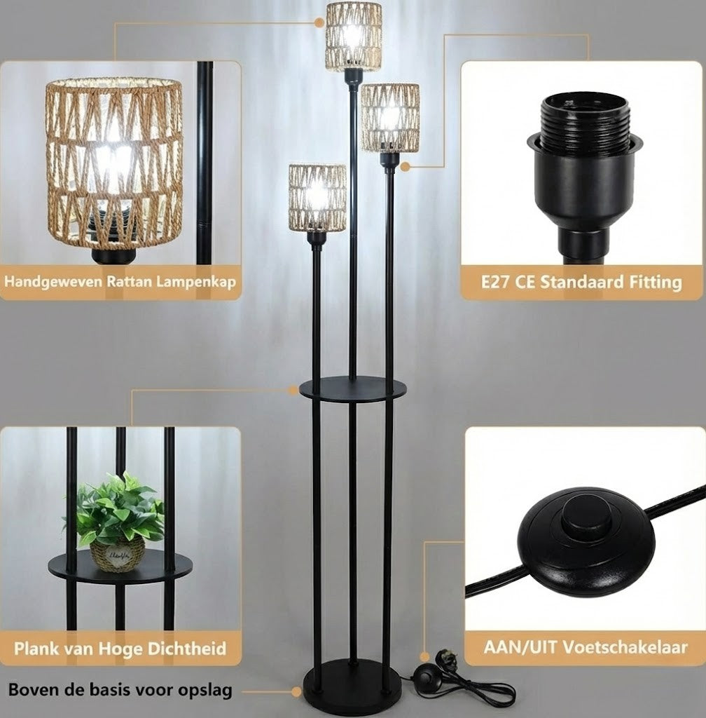 Breng warmte en functionaliteit samen in je interieur met deze unieke Rotan Vloerlamp met Tafel. Deze staande lamp is niet zomaar verlichting; het is een stijlvol meubelstuk dat perfect past in de huidige woontrends zoals Boho, Japandi, Scandinavisch en Industrieel.